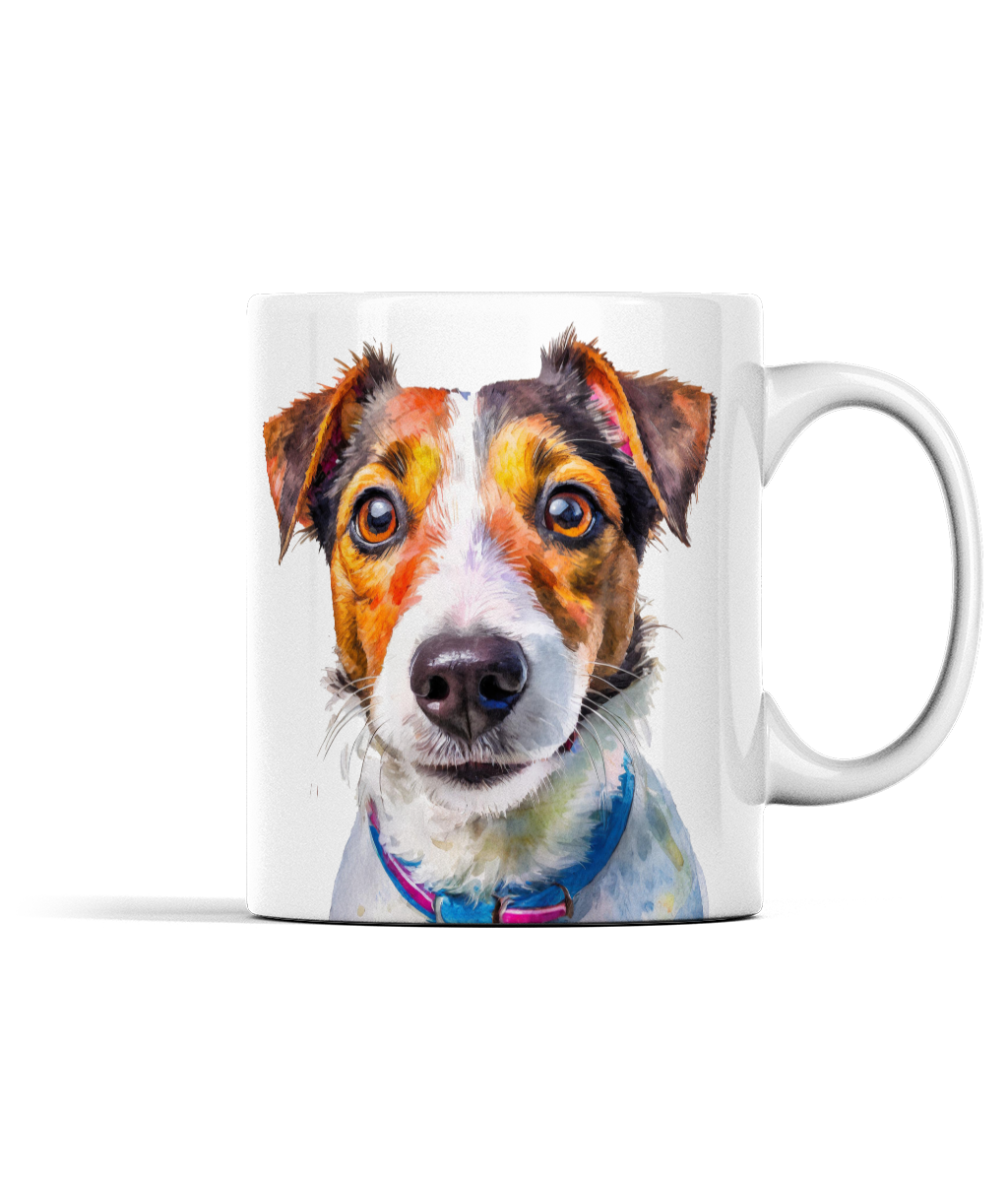 The front of the mug features a vibrant and expressive portrait of a Jack Russell Terrier, complete with its characteristic intelligent eyes and a colourful collar.
