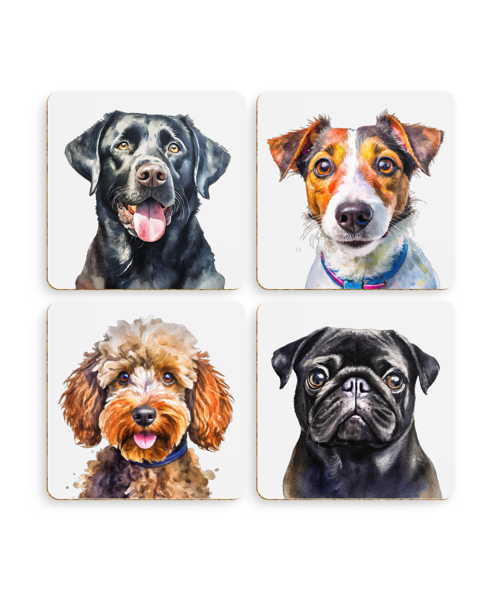 • Pack of 4: This set includes four individual coasters, each featuring a distinct and watercolour dog portrait. From the loyal Labrador to the perky Jack Russell, the cuddly Cockapoo Poodle, and the lovable Pug, there’s a companion for every mood and preference.